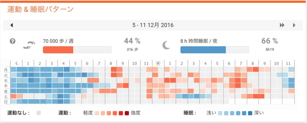 ちなみにこのデータは全部Appleのヘルスケアにも同期されている。ただAppleの場合、これを集めて表示するだけで、それが健康かバロメータを提示してくれないので、今は全く役立たずな感じがする。その点HealthMateは目標設定して、週間レポートを出してくれたり、ユーザのことをちゃんと考えてるなーという部分が見えていて良い。