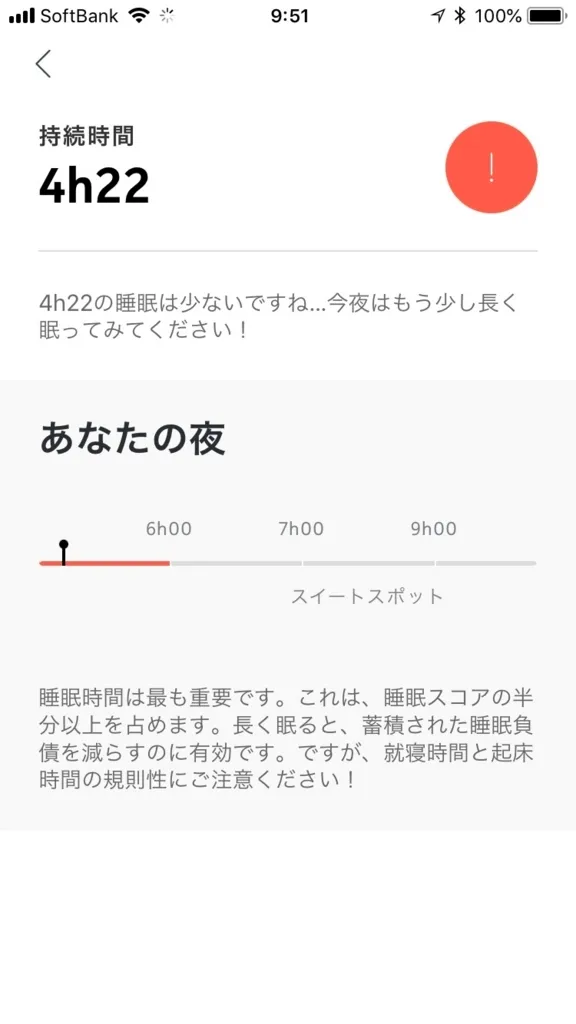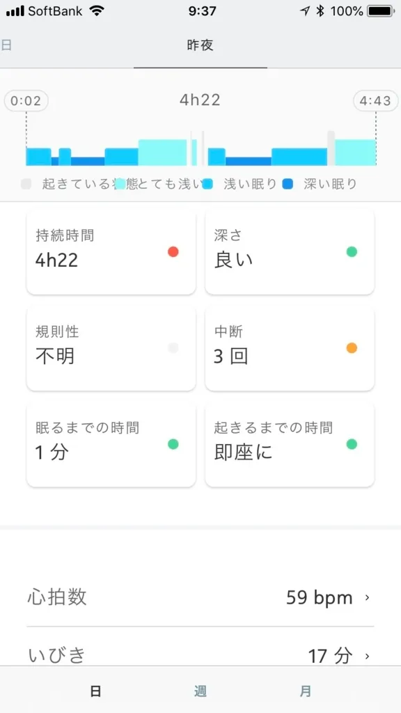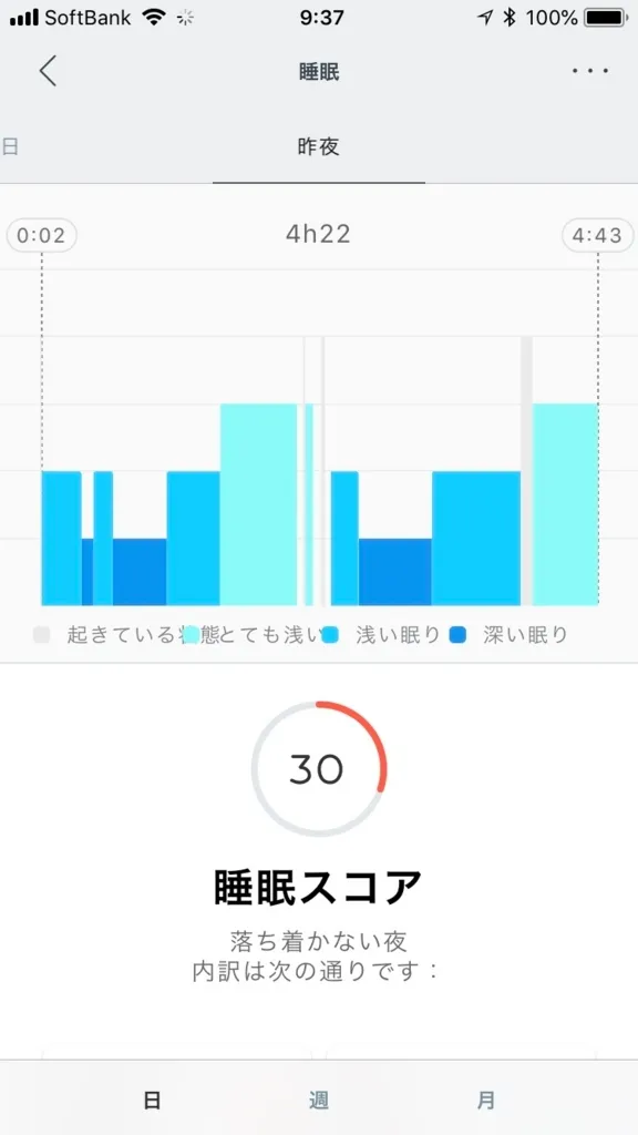 一口に「睡眠を改善する」と言っても、原因が時間なのか、深さなのか、様々な要因がありえます。それに対してより直接的な解決策を提案してくれる、具体的なアクションに結びつけやすくなった、という部分で、かなり使いやすくなったなぁという感じがします。それでも半分以上のスコアは睡眠時間によるらしいので、土日不摂生にした結果こんな感じのグラフになりました。やべぇ/(^o^)\