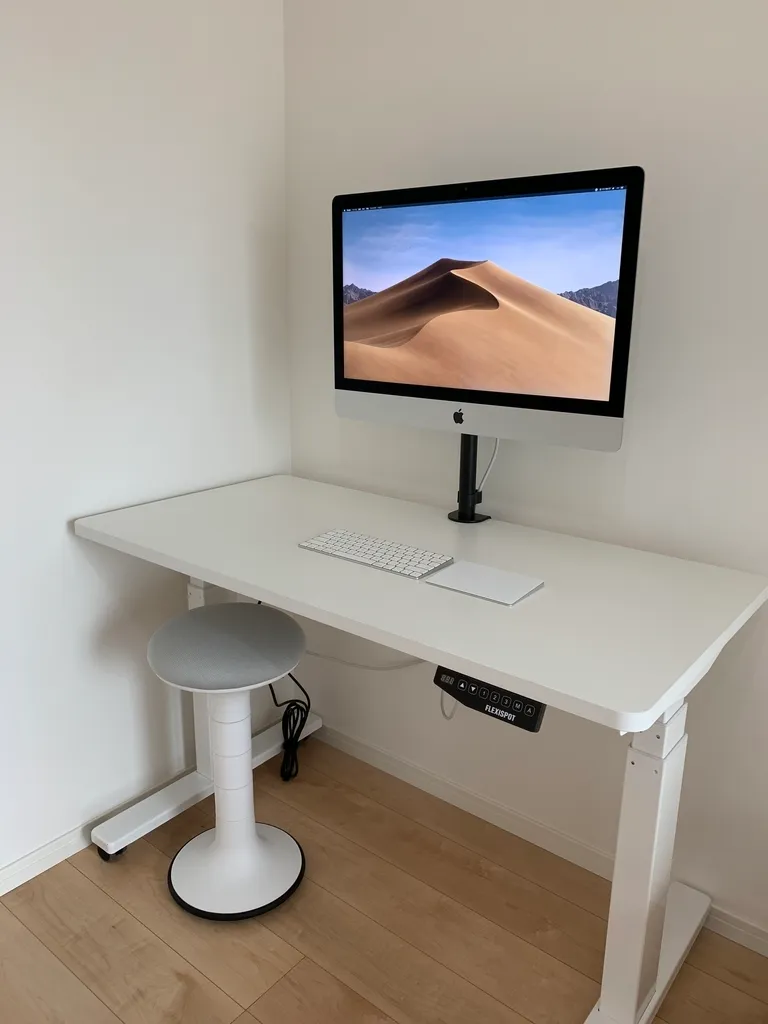 どうしようかなぁとまた考えていた矢先、職場の後輩がスタンディングデスクを買っていた投稿を見た。なるほどそういう選択もありだなーと思ったものの、なかなかこの分野は値段が高くて手が出せないなと感じ躊躇っていた。が、自動昇降デスクが5万を切る価格でFlexiMountから売られているのを発見。キャスターがつけられたり、iMacが装着できる対荷重10kgのアームや対荷重80kgの天板があるのを確認できたため、これは買うしかねぇ!と翻意し購入。