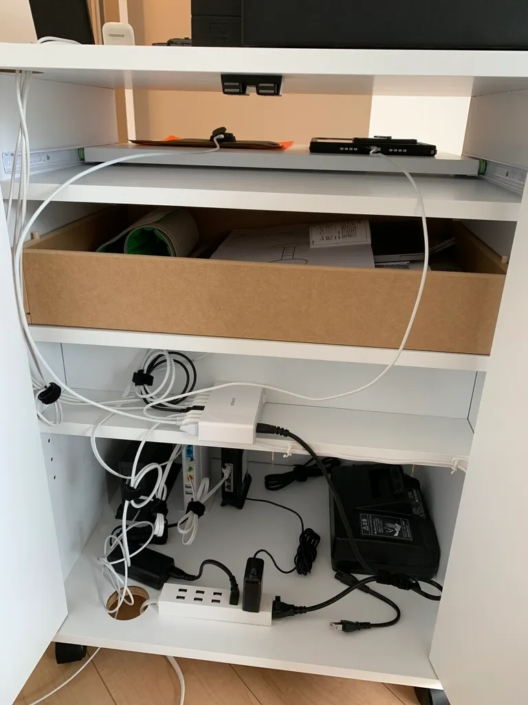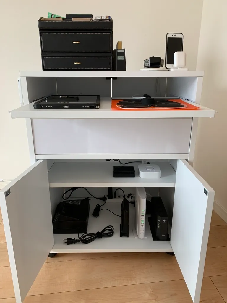 Section titled “Dinos PCデスク”とはいえ、iPhoneやiPadを充電するためのターミナルはどこかに設けなければ落ち着かないので、この空間をどこかに作る必要がある。オーバーナイターの置き場所も然り。ルーターやHueのターミナルなど配線が雑然としがちなものも多い。