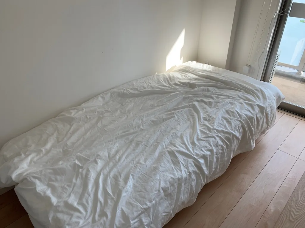 Section titled “買換: ロフトベッド → すのこベッド”もともと、1Kの部屋である程度の広さを確保するのであれば、ベッドを高架するか折りたたむしかないと考えていた(面倒)。またNOKIA Sleepなどの睡眠トラッキングを正確に行いたい(ベッドに座った時の誤作動などが心配…)という点から、黒いパイプのロフトベッドを利用していた。