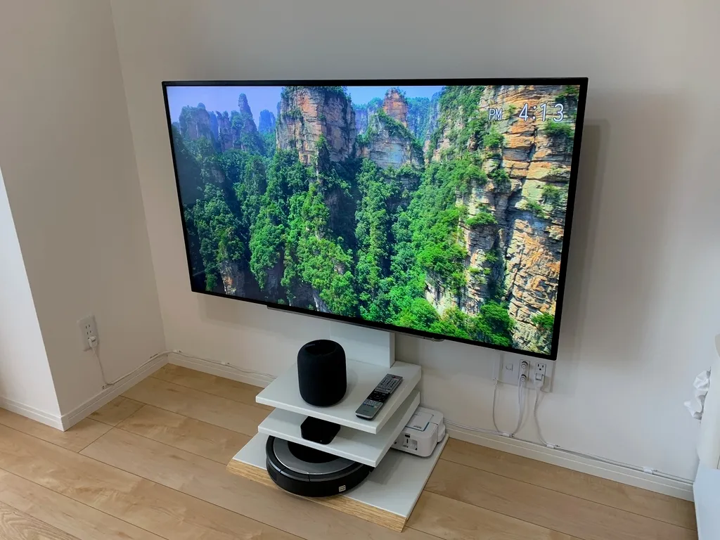 Section titled “買換: 置き型テレビ台 → 壁寄せTVスタンド”1年半前に、DMMの格安4Kディスプレイが出たことで、場所もあるから大型テレビがそろそろ買い時かなと感じるようになり、ゲームでも使えるように。55型の東芝の型落ち4Kモデルを購入した。