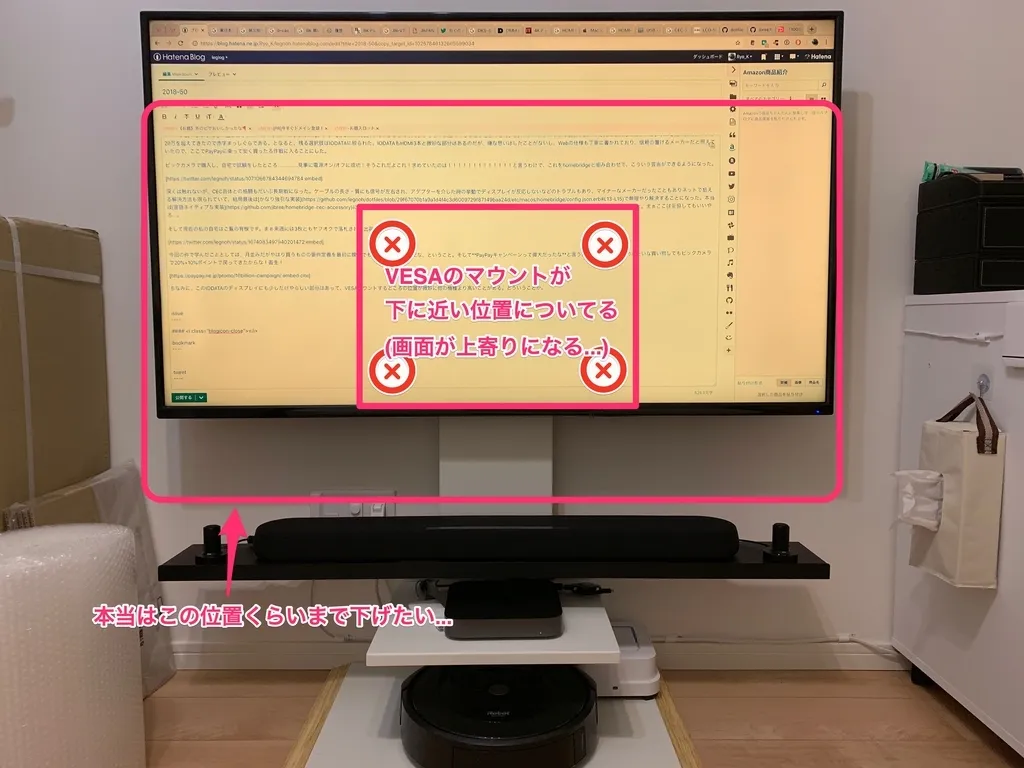 写真で見るとわかりやすいのだが、VESAマウント用のネジ穴がディスプレイ裏面の下側に寄ってしまっている。このせいで取り付け後のディスプレイが全体的に高く上がってしまい、普段座っていると見上げるような構図に。結果、とにかく首が痛くなってしまう...。