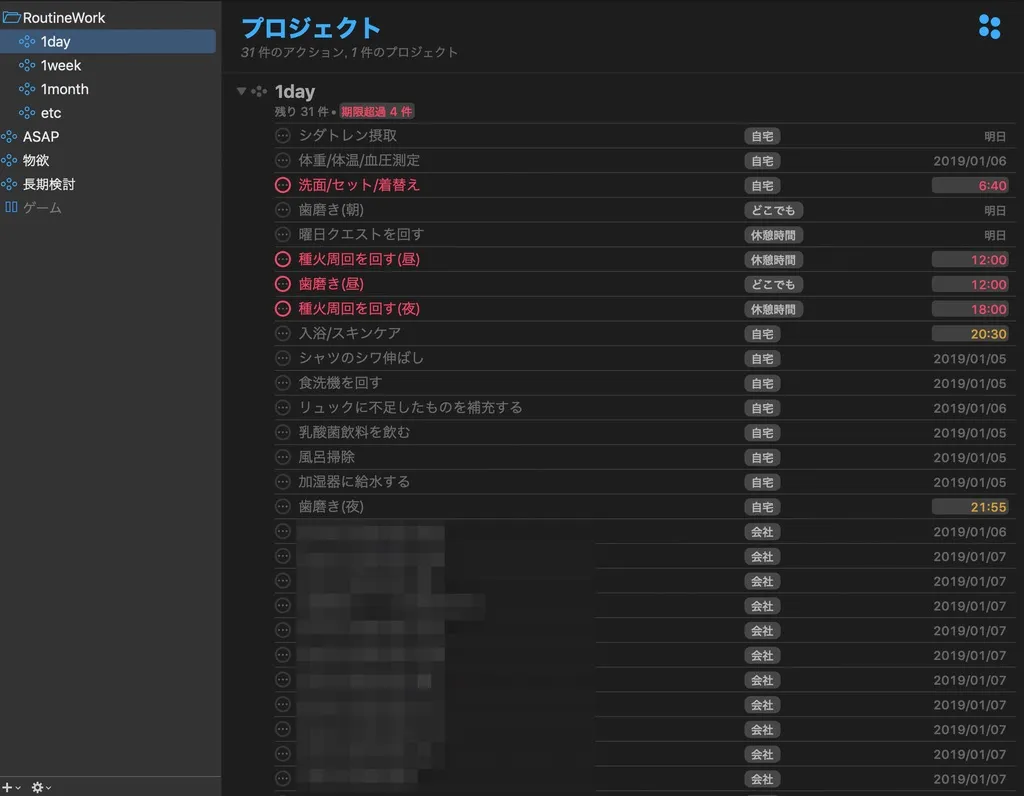 自分で習慣化したいことについては、タスク管理ツールであるOmniFocusにすべてRoutineWorkと言うプロジェクトを作って投入し、毎日リマインドするように繰り返しを設定している。