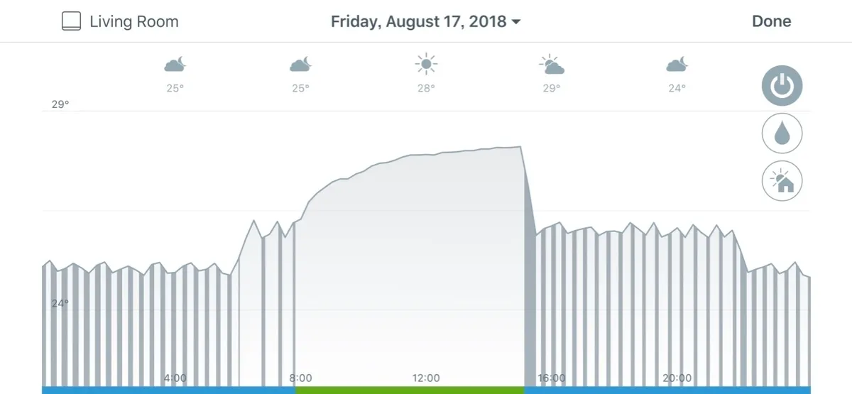 というのも、このtadoは部屋温度の調整方法がなかなか豪快で、部屋が対象の温度になったら一度エアコンを消し、その後温度が下がってきたら再度つけるというロジックになっている。下記は8月の部屋の温度の推移(+エアコンの動作状態を示したもの)だが、自宅にいない時は電源が消えて温度が上がり、帰宅後は自分の26/25度付近で小刻みなオン・オフを繰り返しているのがわかる。