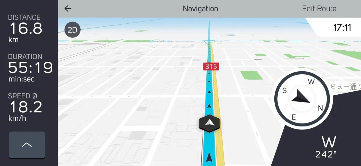 ナビの画面はこんな感じで、日本国内でも普通に機能する。普段はgpxで作った通勤ルートを通るのであまり気づかないが、こいつ自体のルーティングもそこそこ精度が良く、場所を検索してサクッと外出したいときにも結構便利だった。