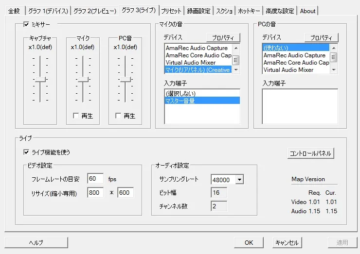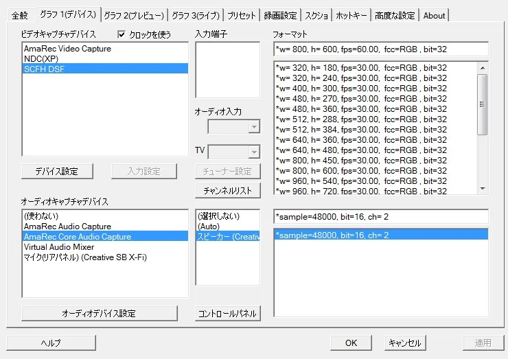 - TVゲームなんかを配信で取込む時は、「グラフ1(デバイス)) タブ」でSCFH DSFとAmaRecCoreAudioCaptureの代わりに使っているキャプチャーボードを選択するだけ。