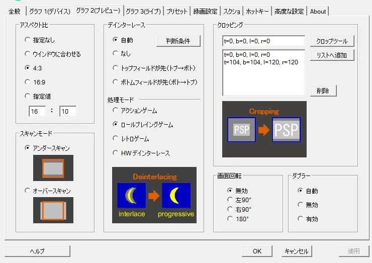 - 別ゲーの時は「グラフ2(プレビュー) タブ」のアスペクト比は注意。PSPや最近のゲームなら16:9ですね。