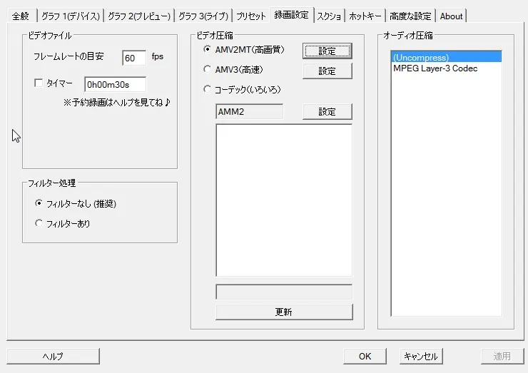 Section titled “アマレコTV”AmaRecTV.exeを起動し、設定画面を出して以下のように設定。SS無い所はそのままでOK。 結構自己流でやってるのでデフォルトのままで良いものもあるかも。