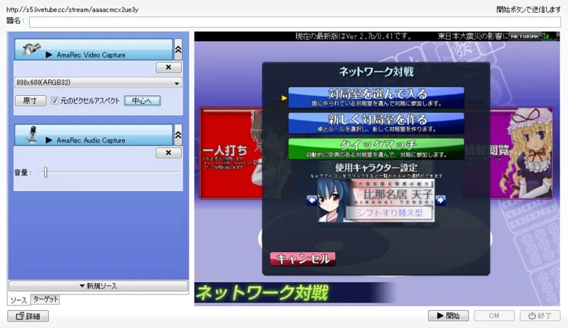 Section titled “livetube.cc クライアント”- アマレコTV・SCFH DSF・幻想麻雀の3つが起動している状態で配信開始ボタンを押して起動。 -「ターゲット」タブで解像度を先に選んでおく。(640×480推奨)